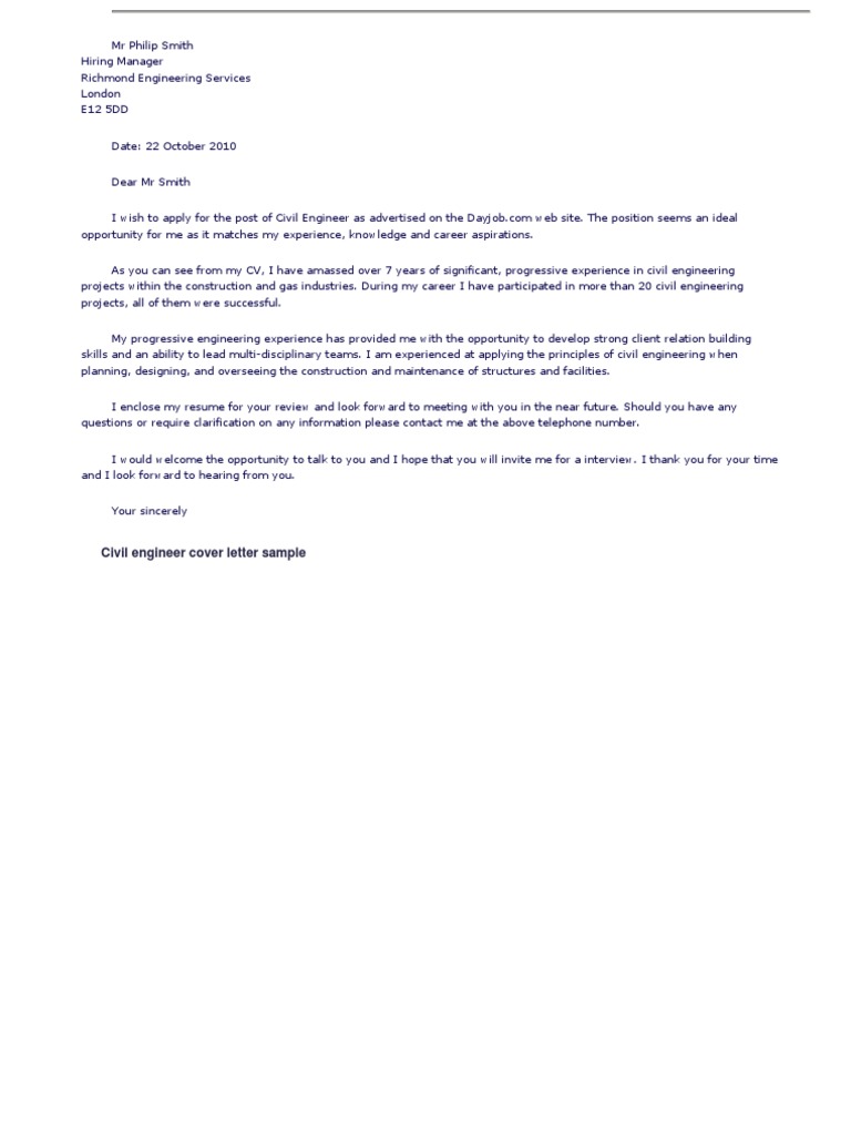 Your cover letter needs to reflect your individual academic and professional achievements. At the same time, remember that the examples below are meant as guides only. Build my cover letter now Get acquainted with this civil engineer cover letter sample. In the same way that you might reference resume samples, the following civil engineer cover letter example will help you to write a cover letter that best highlights your experience and qualifications. With more than 16 years of experience in building and structure development, installation, modification, and maintenance—as well as my. Jobs for civil engineers are projected to grow by 11% (or 32,200 jobs) from 2016 through 2026, according to the bureau of labor statistics (bls). If you're ready to apply for your next role, upload your resume to indeed resume to … Nov 08, 2017 · for writing tips, view this sample cover letter for civil engineering, or download the civil engineering cover letter template in word. Our builder drafted it, taking into account all the tips above and following business correspondence's general requirements. Upon learning of your need for a civil engineer, i felt compelled to submit my resume for your review. September 22, 2020 | by the resume genius team | reviewed by mark slack, cprw. Sep 22, 2020 · civil engineering cover letter example.