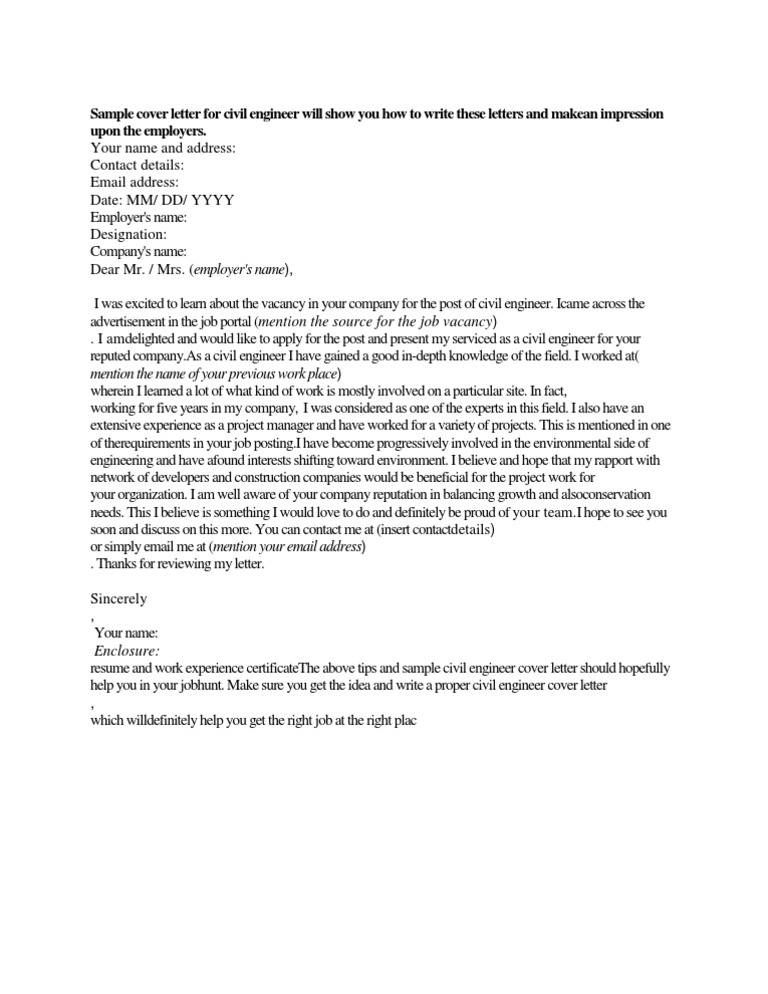 Feb 25, 2020 · junior civil engineer at wsp cover letter sample es hired by; Get acquainted with this civil engineer cover letter sample. Use this example to create your new cover letter. Aug 04, 2016 · comparable civil engineer skills can be seen on the cover letter example displayed below. Choose from 35 cover letter templates and gazillion customization options.